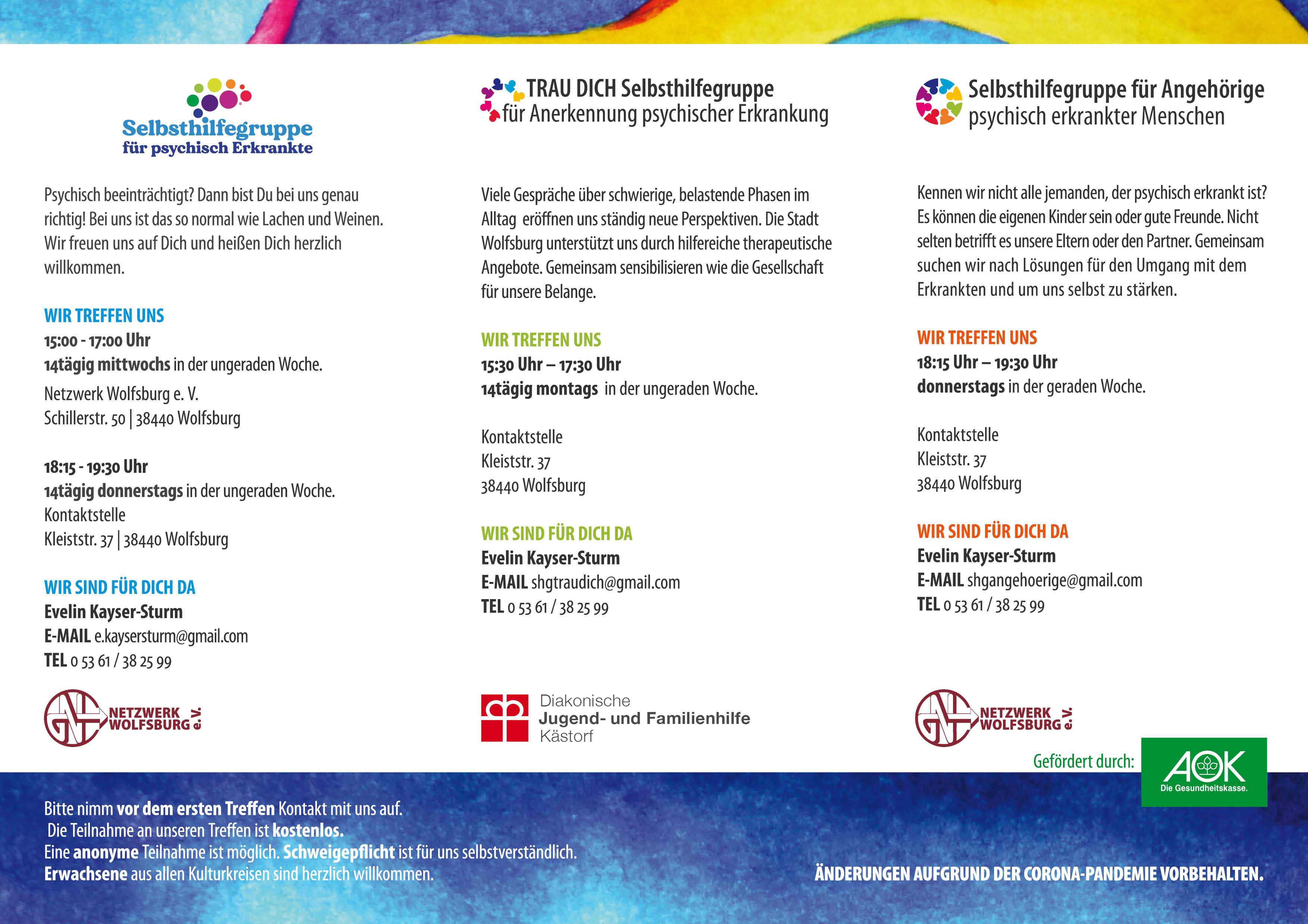 Alle psychischen Erkrankungen sind Thema in der Gruppe. Das Gespräch steht hier im Vordergrund. Jahrelange Erfahrung vieler Mitglieder kann immer wieder zur Hilfestellung neuer Teilnehmer beitragen. Wenn Termine nicht passen, ist telefonischer Kontakt möglich, ebenso per E-Mail. Es muss kein Name genannt werden, man kann anonym bleiben. Wünsche and die Gruppe und Anregungen sind hier willkommen!